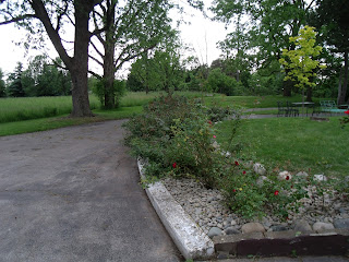 We shoveled the stones around the mailbox to a depth of 3 to 4 inches. But that didn't even put a dent into the pile of rocks in the bed of the truck. So we decided to put the remaining rocks around the rosebushes that line the walkway to the kitchen door and edge the driveway. This will requiring buying an additional 1/2 yard but we really like the looks of it, so far. The light color of the rocks really show off the dark purple of the roses. An added bonus is that it will keep the dirt from washing onto the walkway when we have a gully washer of a rain storm.